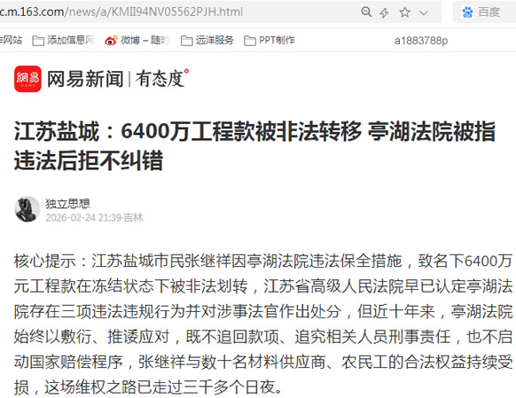 江苏盐城:6400万工程款被非法转移亭湖法院被指违法后拒不纠错