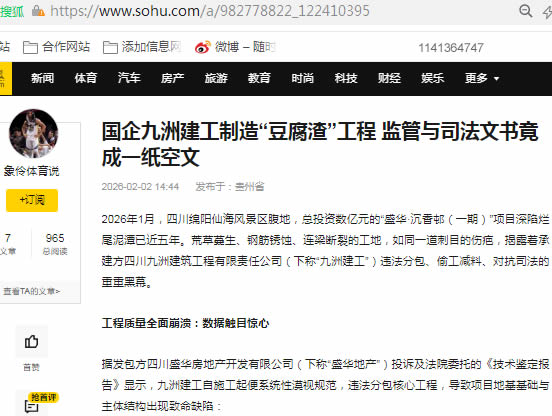 2026年1月,四川绵阳仙海风景区腹地,总投资数亿元的“盛华·沉香邨(一期)”项目深陷烂尾泥潭已近五年。荒草蔓生、钢筋锈蚀、连梁断裂的工地,如同一道刺目的伤疤,揭露着承建方四川九洲建筑工程有限责任公司(下称“九洲建工”)违法分包、偷工减料、对抗司法的重重黑幕。
